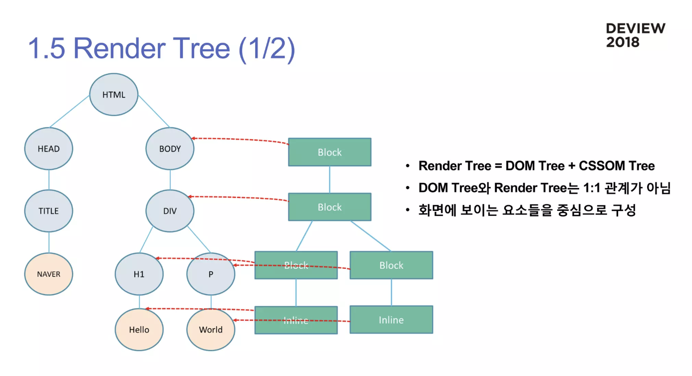 위 그림에서 왼쪽은 DOM Tree, 오른쪽은 Render Tree 로, 둘의 관계를 나타내고 있다. DOM 트리와 렌더 트리는 1:1 대응 관계가 아니다. 예를 들어, head 의 경우 DOM Tree 에는 존재하지만, 렌더링에는 필요 없는 태그이기에 Render Tree 에는 존재하지 않는다. 뿐만 아니라, display: none 속성을 가진 노드 또한 렌더링에 포함될 필요가 없기 때문에 Render Tree 에서 제거된다.