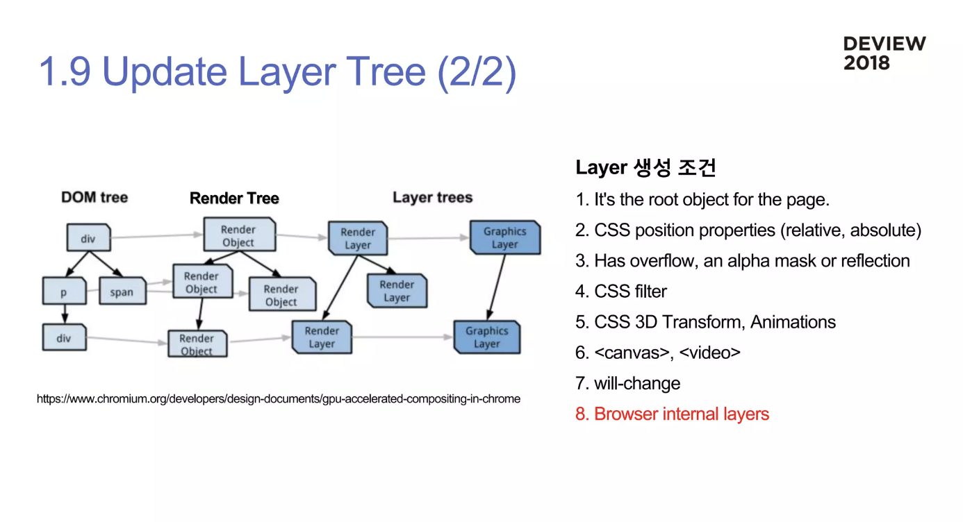 그러면 어떤 기준으로 레이어를 나눌까? 위 이미지에 나와 있지만, 몇 가지를 적어보자면 대표적으로 transform 속성이 있다. 우리가 애니메이션을 적용할 때 transform 속성을 사용하면 좋다고들 하는데, 그 이유는 transform 을 위한 별도의 레이어가 존재한다. 따라서, 애니메이션에 의해 요소가 움직여도 딱 해당 레이어만 다시 페인팅하면 된다. 한가지 재미있었던 점은 스크롤바도 별도의 레이어에서 처리된다고 한다. 그 외에도 브라우저의 내부적인 구현에 의해 다양한 경우에 레이어가 생성된다고 한다.