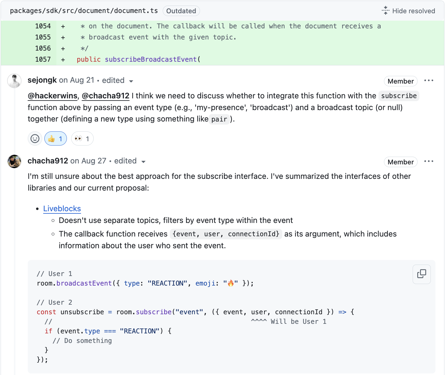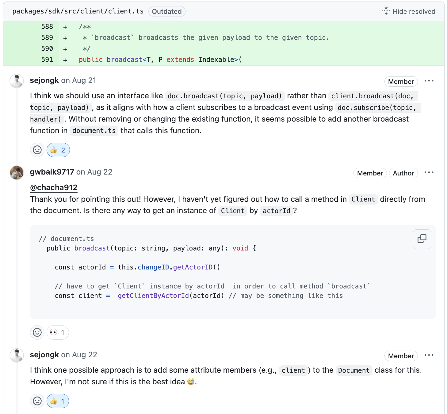 })비록 간단한 해결책이긴 하지만, 이 방식을 통해 기존에 다루지 못했던 다양한 이벤트들을 다룰 수 있게될 것이다. 참고로, 위 내용은 Broadcast 기능이 도입된 배경에 대해 이해를 돕기 위해 설명했지만 내가 구현한 부분은 아니다. (관련 PR) Yorkie 는 새로운 기능이 추가될 때 코어인 Yorkie 에 먼저 추가되고 이후에 JS SDK, iOS SDK, AOS SDK 프로젝트 등에 순차적으로 적용된다. 나는 그 중 JS SDK 에서 Yorkie 의 Broadcast 기능을 사용할 수 있도록 일종의 다리를 만든 셈이다.